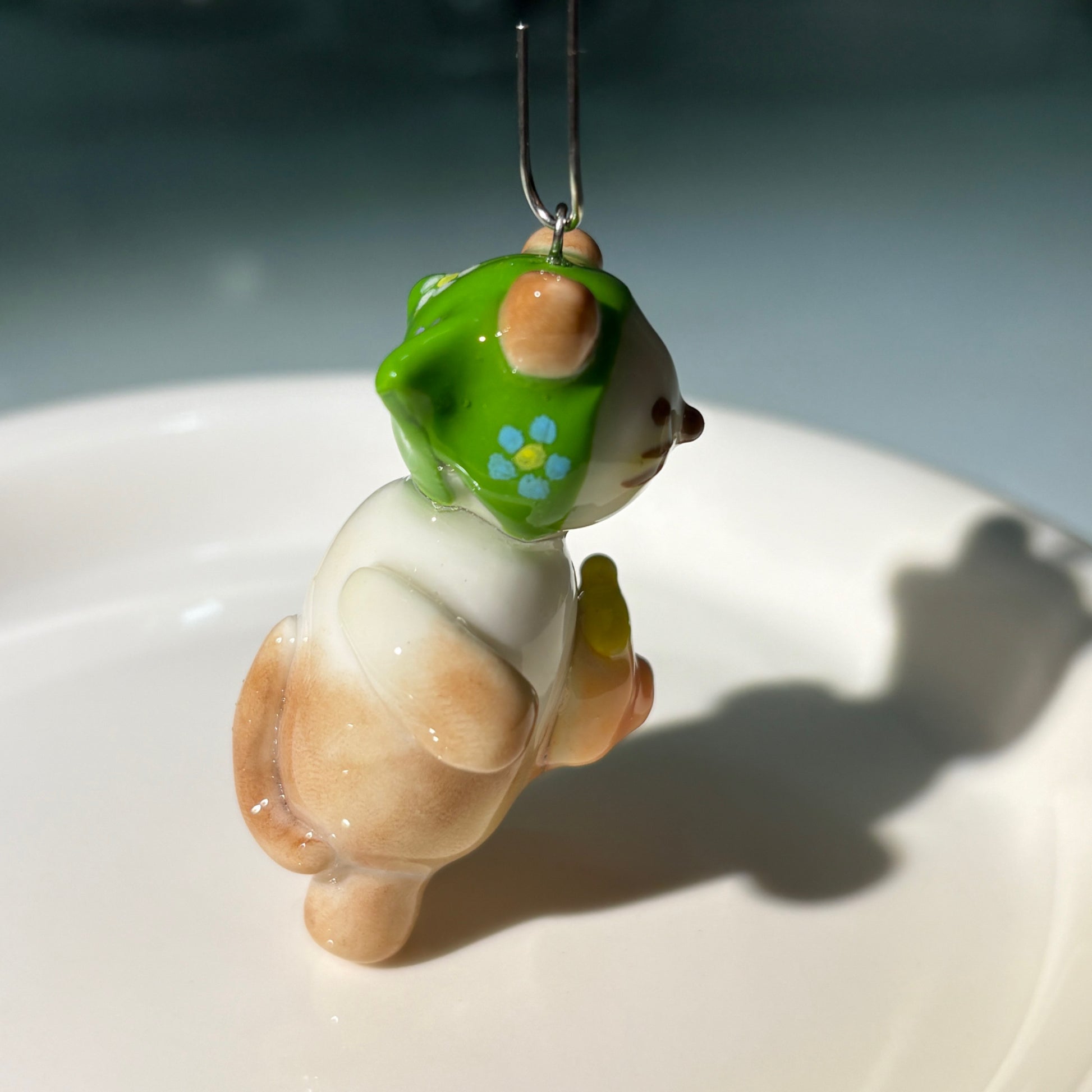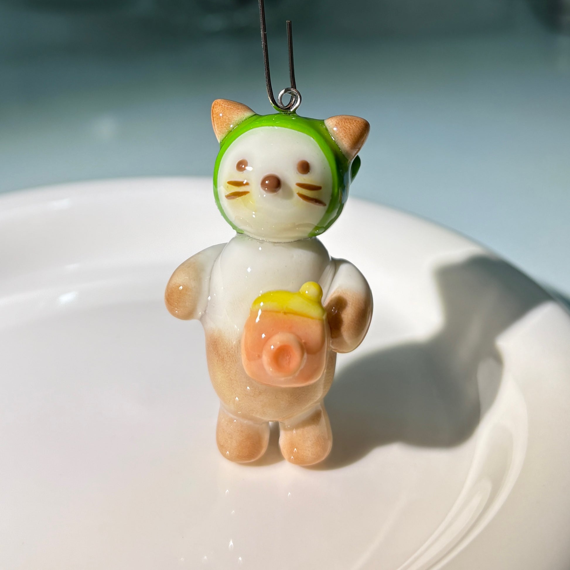 Adorably handcrafted Siamese cat keychain wearing a green bandana with playful polka dots and flower patterns, sweetly holding a tiny pink camera. Each piece is lovingly created from lightweight polymer clay and sealed with a glossy finish for durability. Perfect for adding a touch of whimsy to keys, bags, or backpacks!